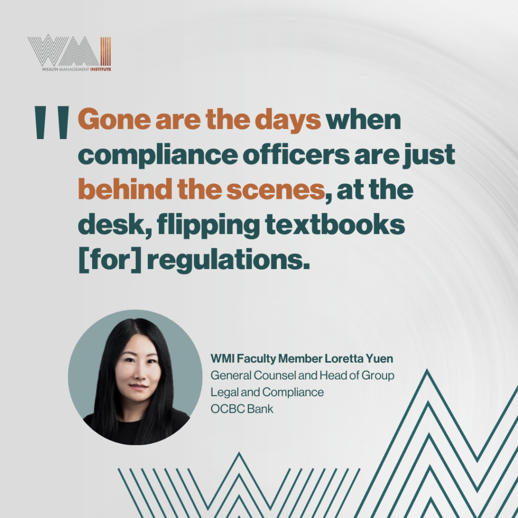“By immersing myself in a wealth of information, I can ensure that I remain well-informed and equipped to address emerging compliance challenges,” highlighted Loretta. In addition to keeping pace with industry trends, Loretta recognises the importance of giving back to the compliance community. As a fervent advocate for imparting practical knowledge, she actively engages in teaching and sharing her experience at WMI. By equipping future compliance officers with practical insights and skills, she contributes to uplifting the standards of compliance in Singapore.